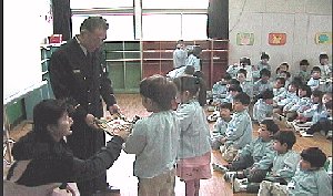 「皆さん立派に避難できましたね。」 と消防士のおじさんからお誉めのことばをいただきました。 先週の雪で第2グランドの状態が悪く避難できなかったのでホールでビデオを見せて頂きました。 | ![]() |