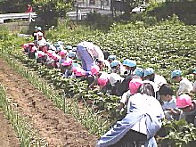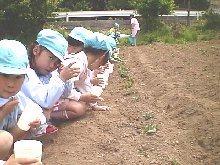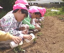 化成肥料を少量ですが事前に蒔いておき,その後子どもたちがコップをつかって土を根っこの部分に足してあげました。 |